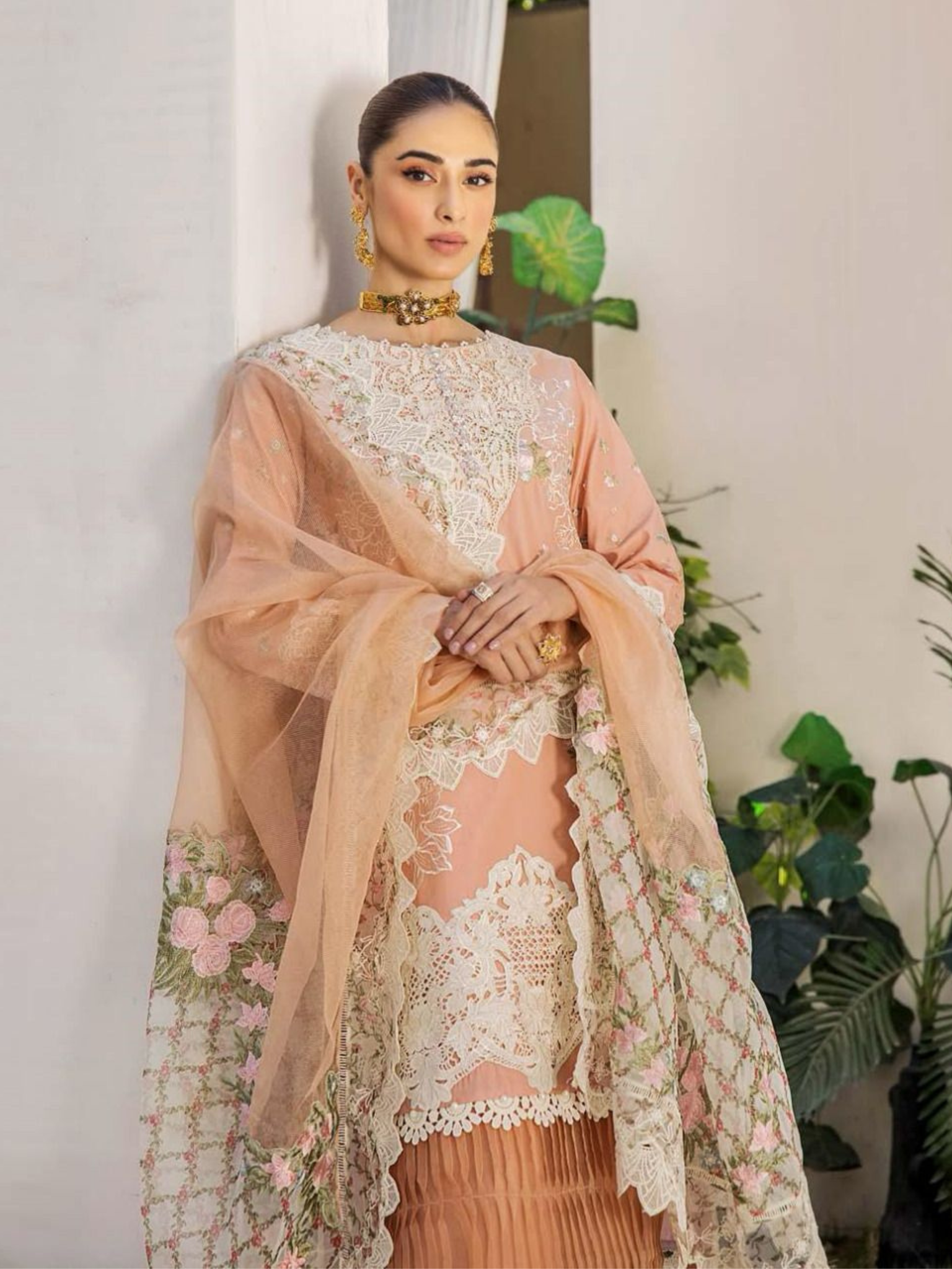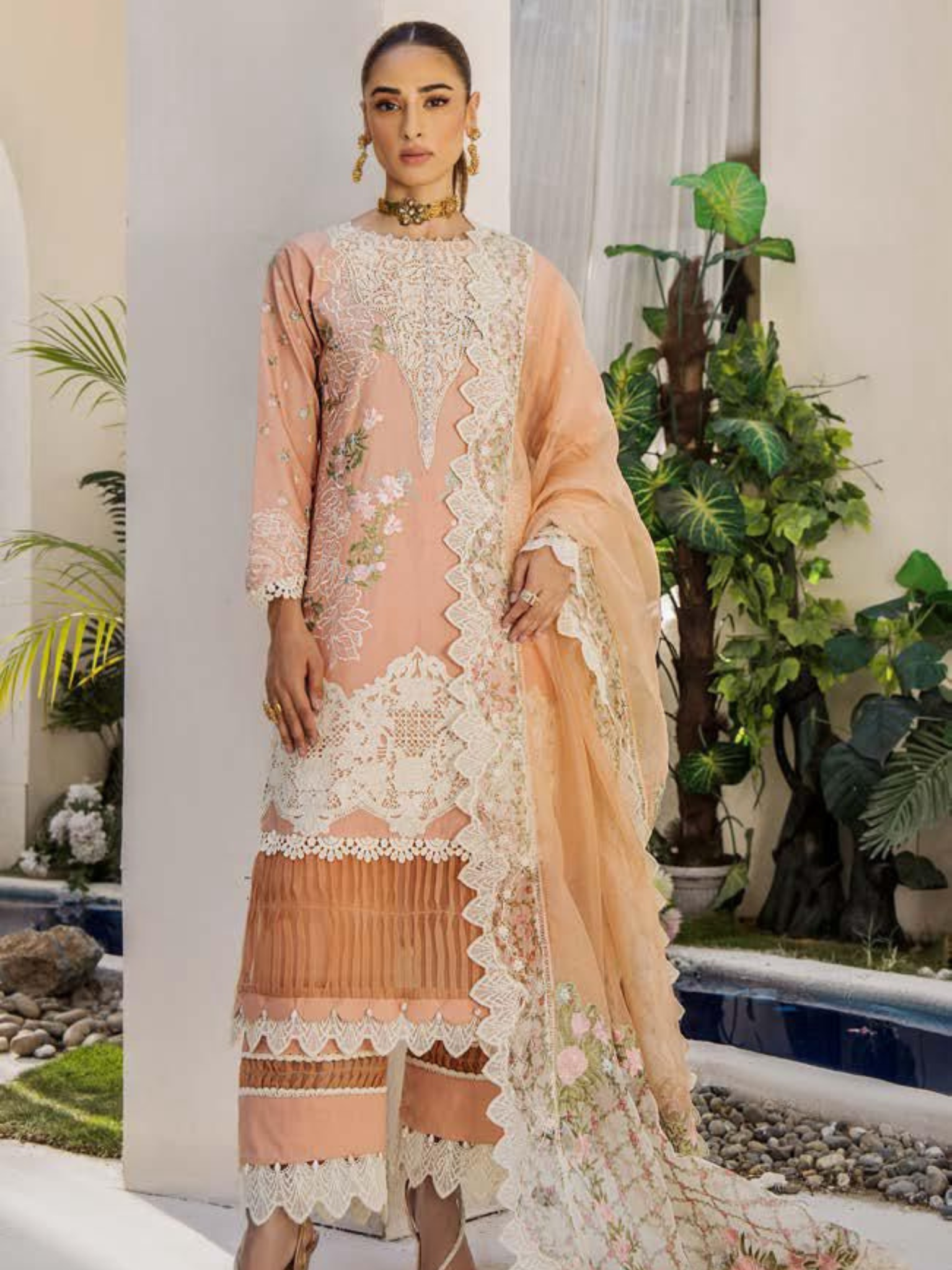 Lawn embroidered shirt front, lawn embroidered shirt back, lawn embroidered shirt sleeves, cutwork lace neckline, rajjonet lace for neckline, handwork crystal embellished plaquette for neckline, rajjonet organza printed embroidered dupatta, cotton dyed trouser.
