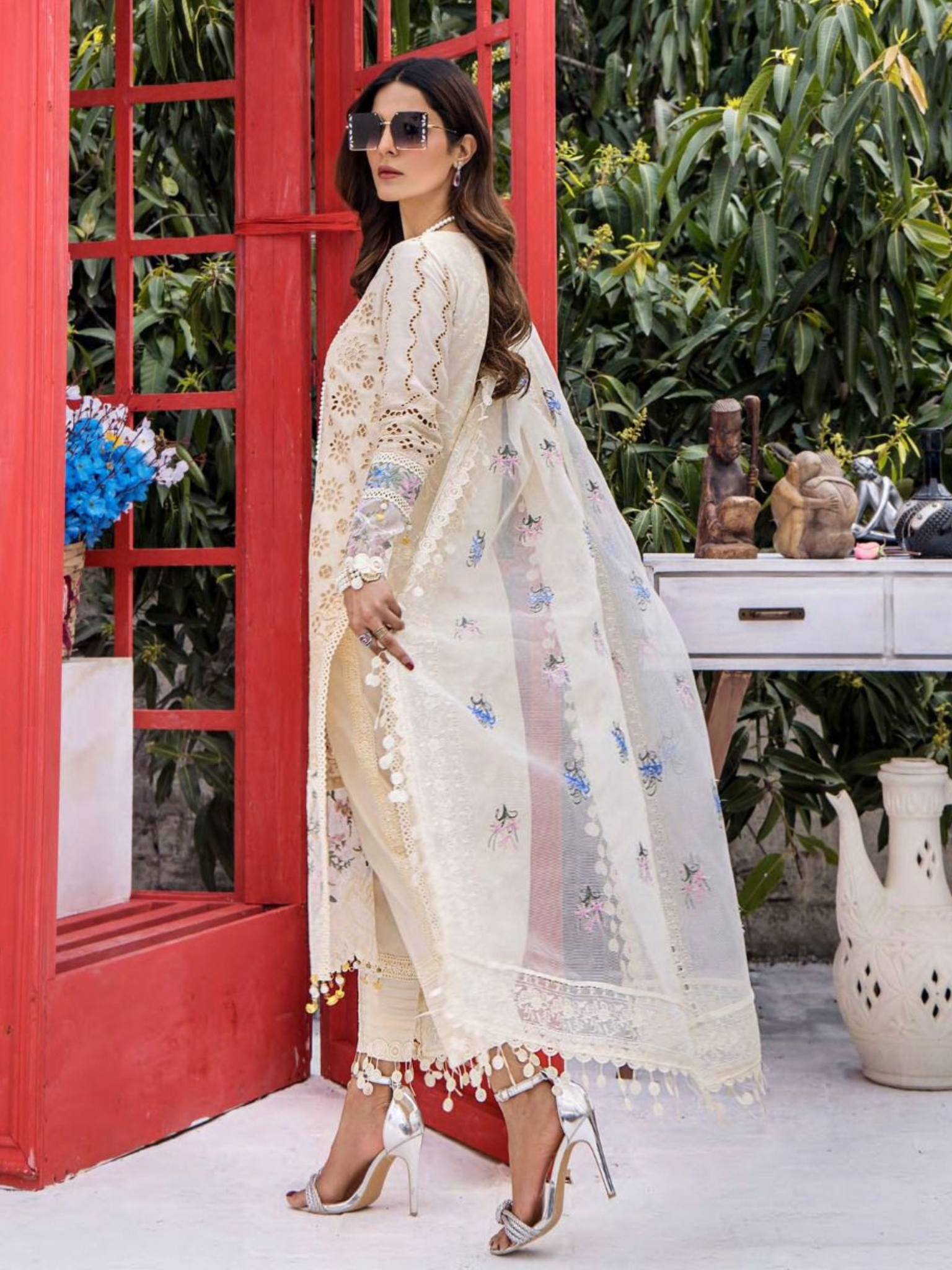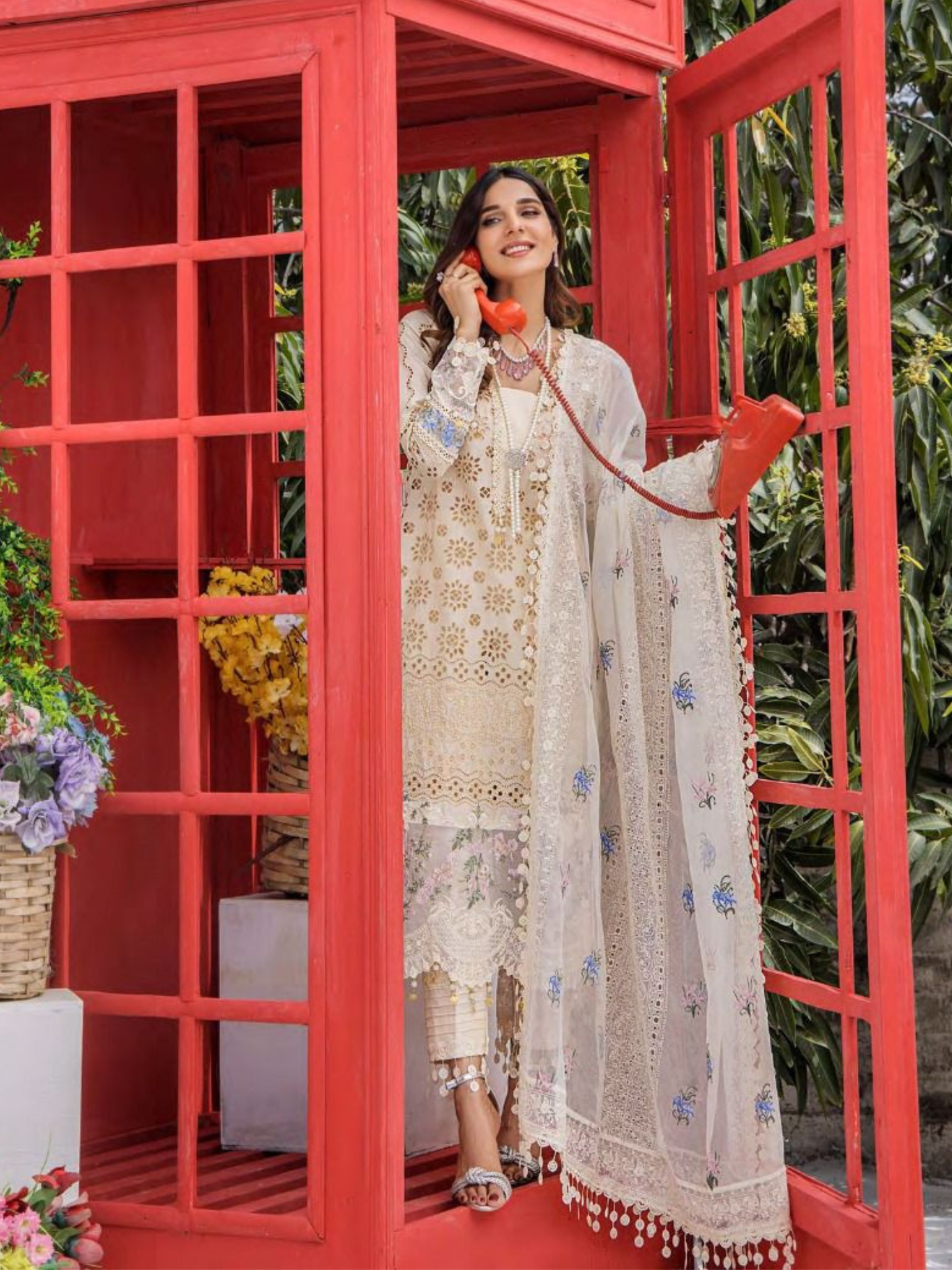 Schiffli lawn shirt front, schiffli lawn shirt sleeves, lawn pearl printed shirt back, embroidered daman for front, embroidered lace, embroidered border, embroidered patti, rajjonet schiffli embroidered dupatta, cotton dyed trouser.